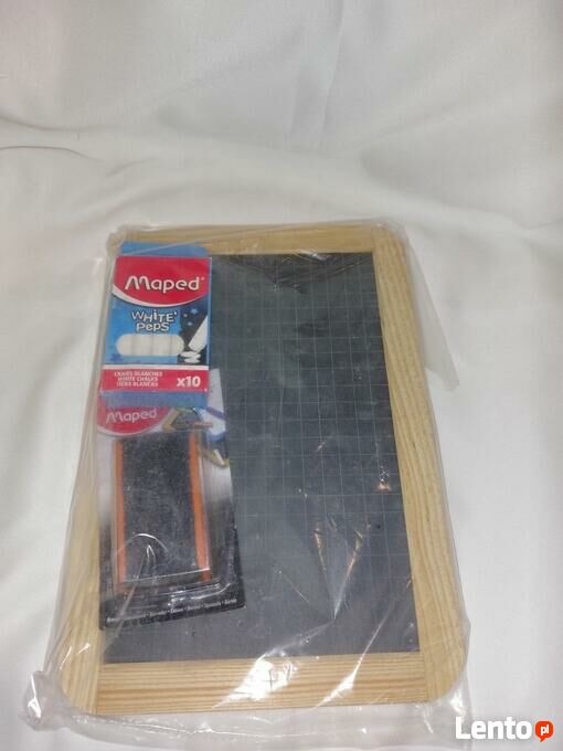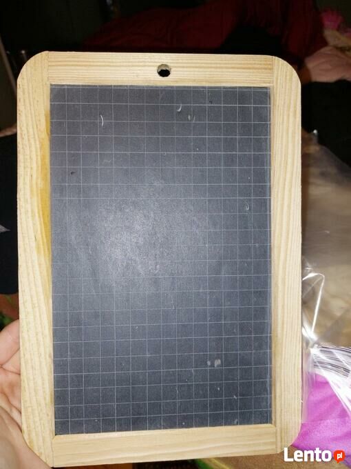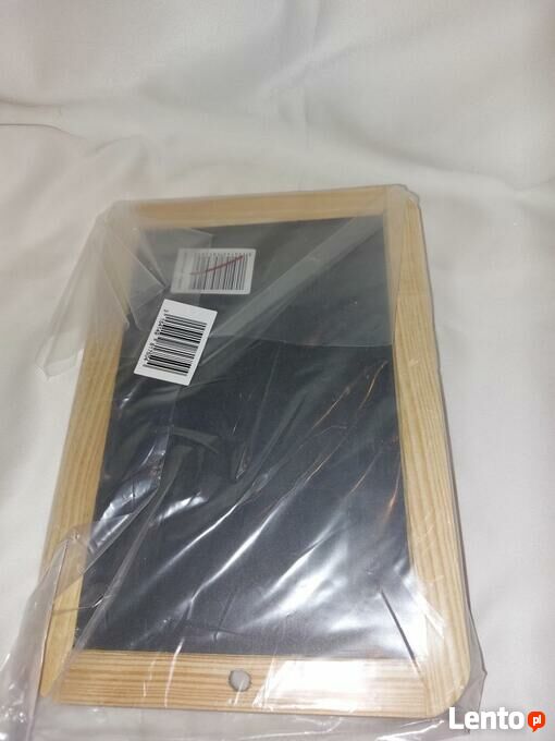 Mała tablica na kredę z drewnianą ramką. Zestaw 10 białych kred i gąbka do zmazywania.Produkt nie używany